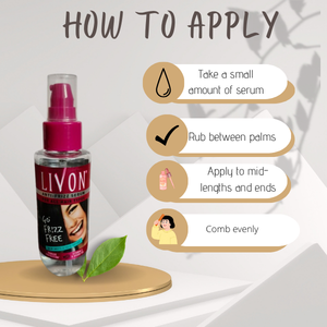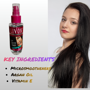 Livon Anti-Frizz Hair Serum is a lightweight, non-sticky hair care product designed to control frizz and improve hair smoothness. It forms a thin protective layer over the hair strands, helping reduce dryness and tangles while adding a natural shine.