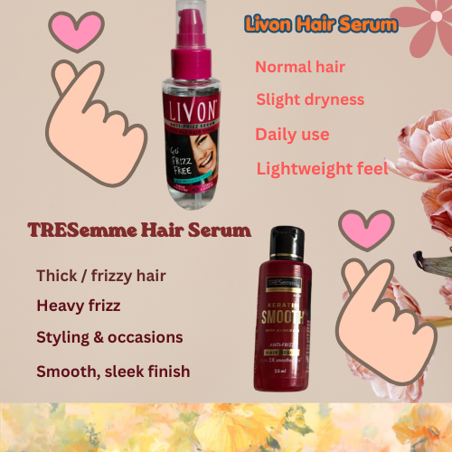 When comparing Livon Vs TRESemme Hair Serums, the main difference lies in their formulation and performance. Livon is lighter and more suitable for everyday use, while TRESemme offers deeper smoothening and a more polished finish. Livon focuses on quick frizz control and detangling, whereas TRESemme provides a stronger smoothing effect for stubborn frizz.